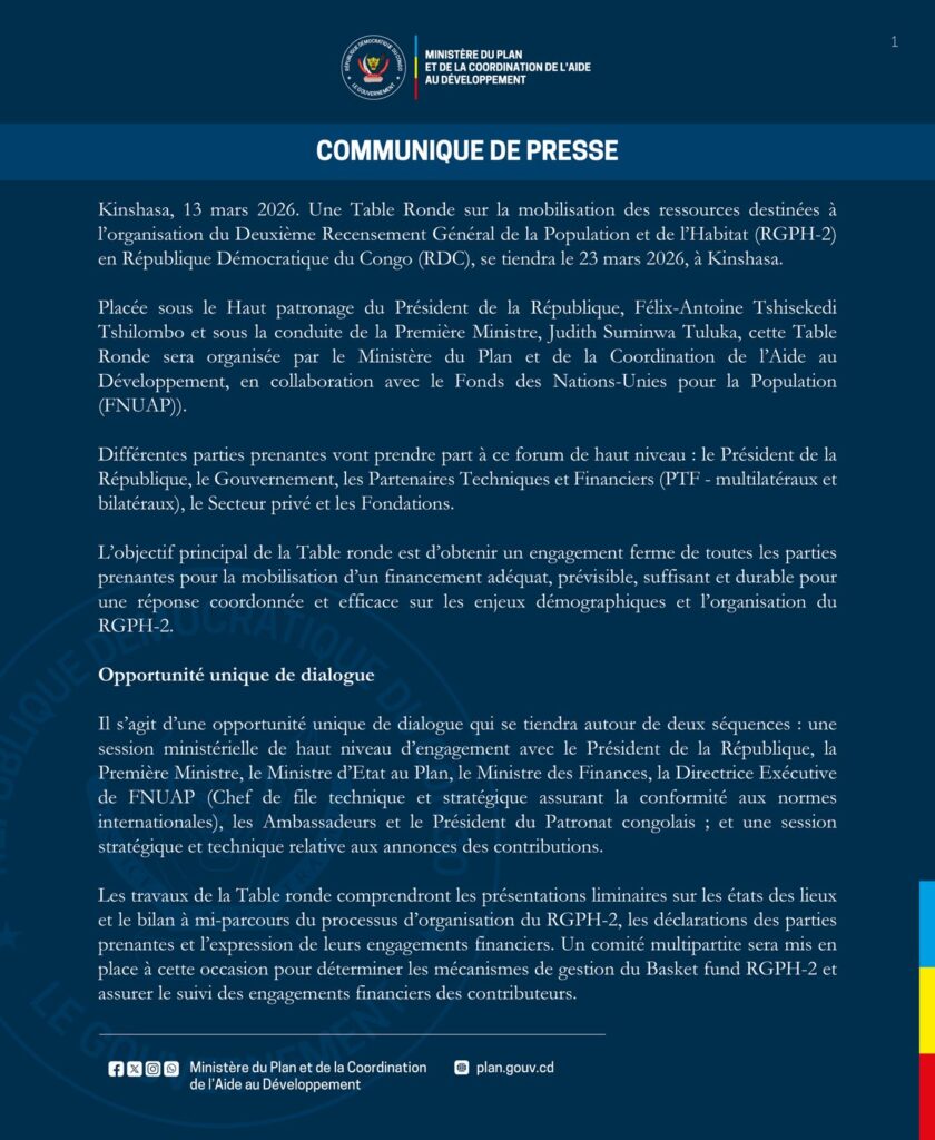 23 mars à Kinshasa : Enfin, la grande Table-ronde des bailleurs de fonds pour le financement du deuxième recensement général de la Population et de l’Habitat en RD Congo