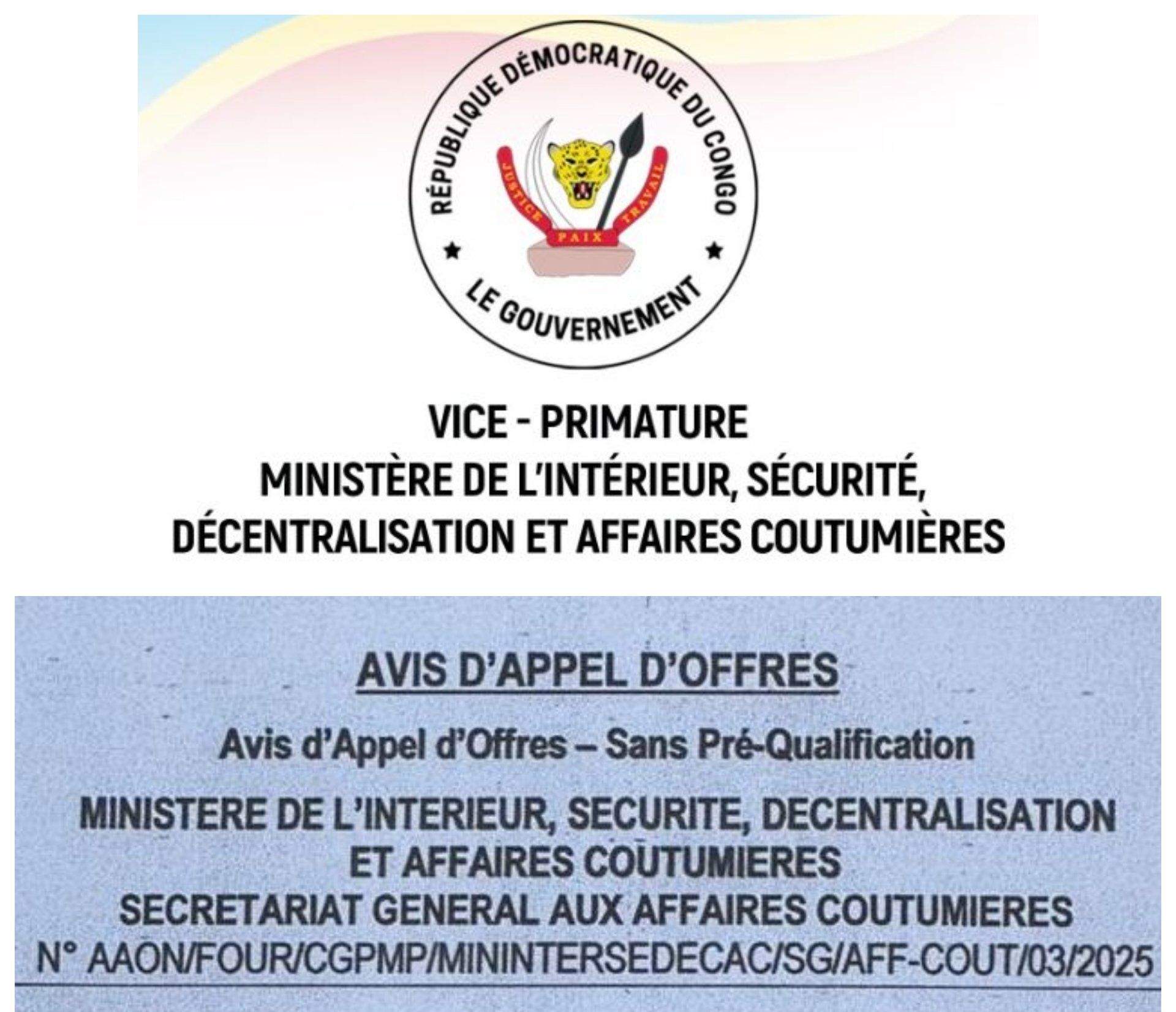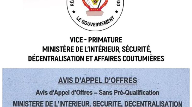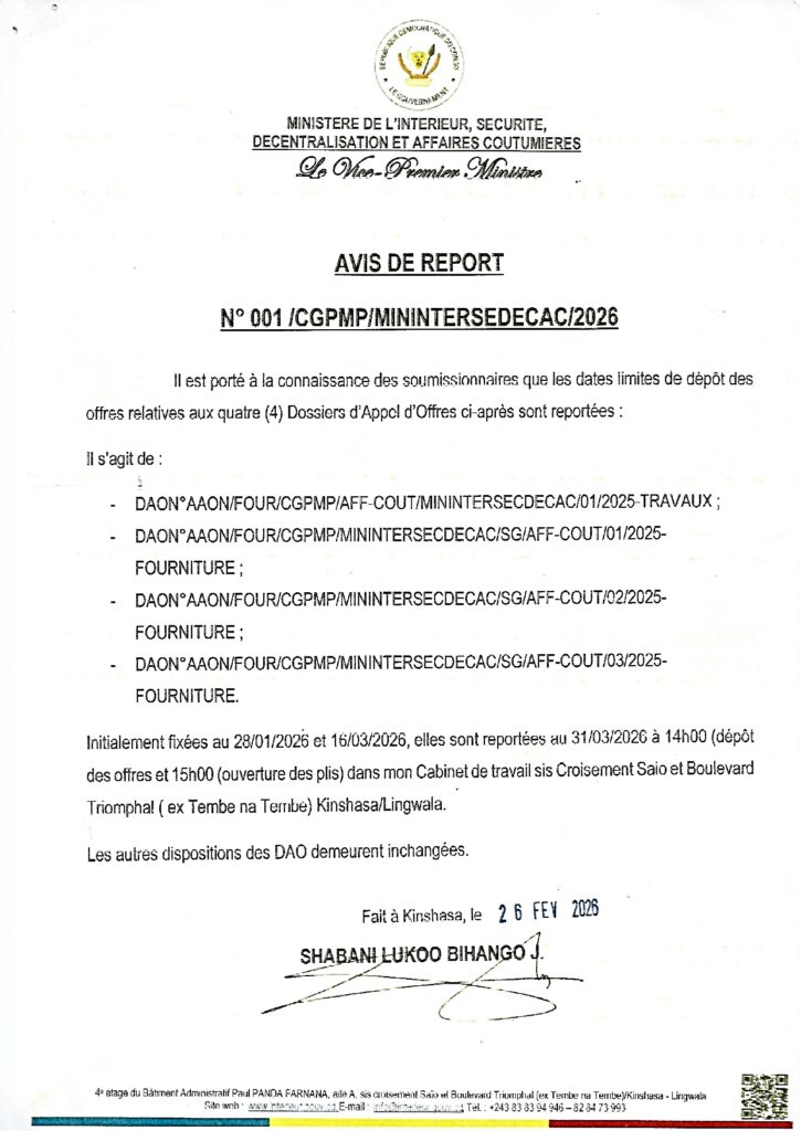 Les Avis d’appel d’offres du ministère de l’Intérieur, Sécurité, Décentralisation et Affaires Coutumières, publiés et initialement prévus pour se clôturer le 28 janvier et le 16 mars 2026, sont reportés au 31 mars 2026, à 14h00 (dépôt des offres et 15h00 ouverture des plis, au Cabinet de travail du Vice-premier ministre de l’Intérieur, sis croisement de l’avenue Saio et Boulevard Triomphal (ex Tembe na Tembe) à Kinshasa Lingwala, indique le courrier signé des mains du Vice-premier ministre, ministre de l’Intérieur, Sécurité, Décentralisation et Affaires Coutumières, Jacquemain Shabani Lukoo Bihango.