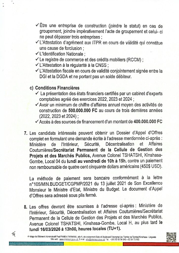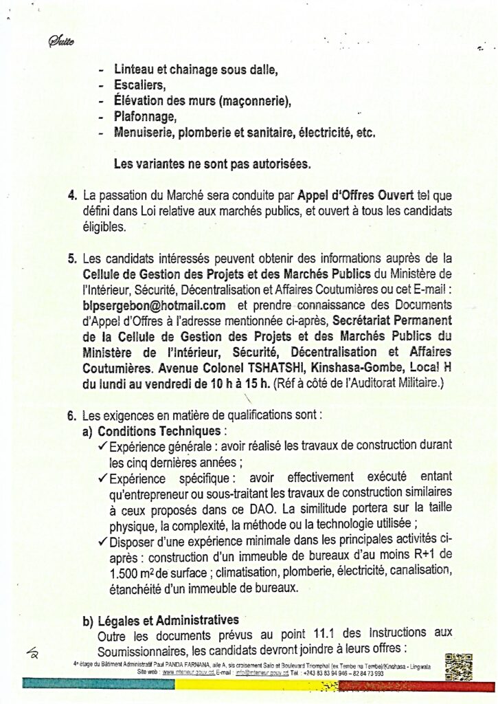 Avis d'Appel d'Offres pour les travaux de construction des logements sociaux au profit des Peuples Autochtones (Pygmées) de la Republique démocratique du Congo et des Bureaux des Chefs de Groupements dans le Territoire de Kiri dans la province de Mai-Ndombe.