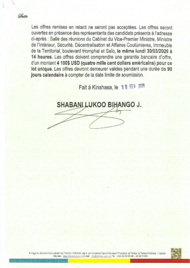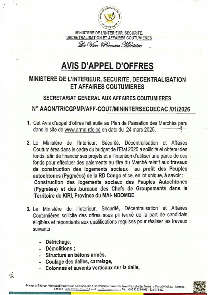 Avis d’Appel d’Offres pour les travaux de construction des logements sociaux au profit des Peuples Autochtones (Pygmées) de la République démocratique du Congo et des Bureaux des Chefs de Groupements dans le Territoire de Kiri dans la province de Mai-Ndombe.